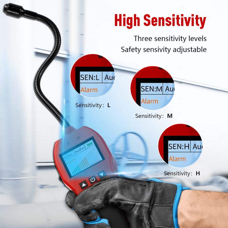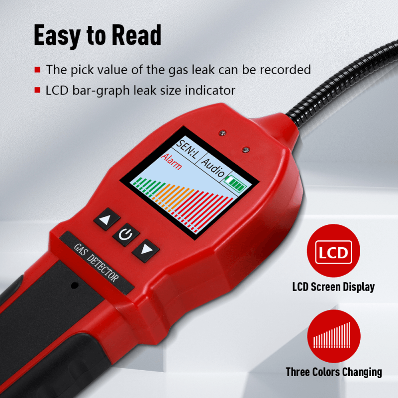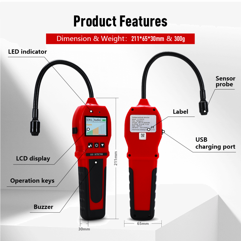 The detector utilizes an imported gas sensor that detects gas leak through natural diffusion, offering excellent sensitivity and repeatability. The case of the detector utilizes high-strength engineering plastic and composite anti-slip rubber, ensuring durability, a comfortable grip, and protection against water, dust, and explosions.